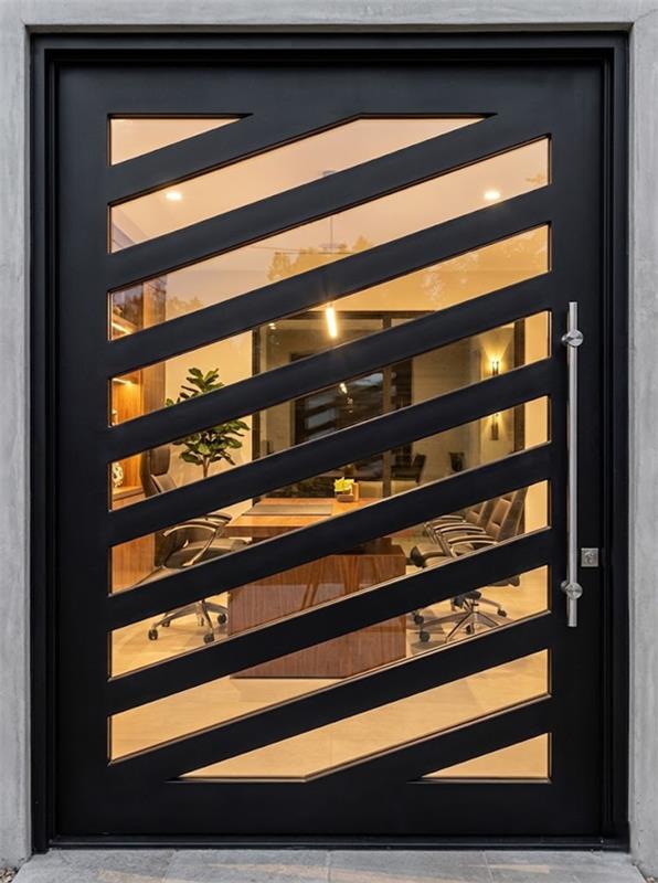 The door is beautifully complemented by a large glass panel, which runs vertically along the edge. This glass element not only enhances the visual appeal but also allows natural light to flow into the space, creating a bright and welcoming atmosphere. The glass is crafted to provide privacy while still offering transparency, striking the perfect balance between openness and seclusion.