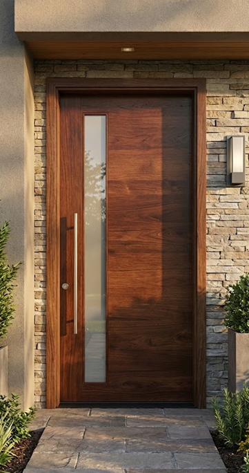 Sleek and contemporary design, featuring a rich, dark wood finish that exudes elegance and sophistication. Its standout feature is the vertical frosted glass panel on the left side, which adds a modern touch while allowing natural light to filter through. This panel contrasts beautifully with the warm wood tones, creating a visually striking appearance.
