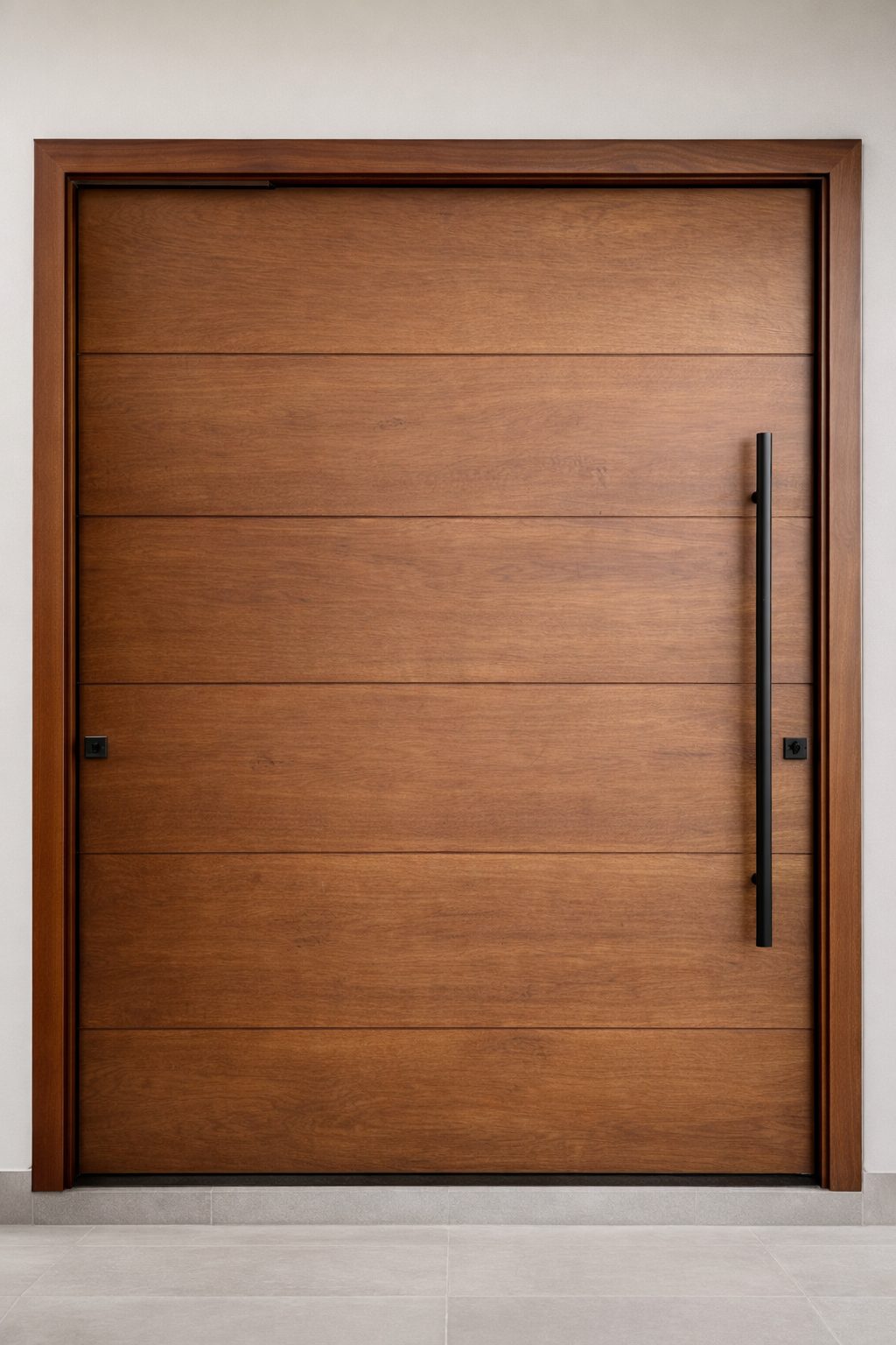 This stunning custom door features a chevron pattern crafted from rich wood. The chevron design adds a touch of modern sophistication to any entryway, while the warm tones of the wood create a timeless elegance.